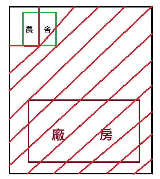 該案為近期接到特定目的事業用地變更,與業者洽談後發現,他的特登納管範圍不是全部,而是下列圖表中斜線的範圍,他農舍在當年申請時,建築師畫了兩戶一照,但不知為何該承辦只納管下列範圍,對方領域展開的方式相當特別,一開始無法招架差點被攻擊的體無完膚,導致我一開始想放棄本案,而業者也一直說這是合法農舍,稱該代辦說也不用拆,所以就這樣納管了,我方遭受精神攻擊使得臉露出黑色三條線一直無法消退,第一回合暫時戰敗撤退。
