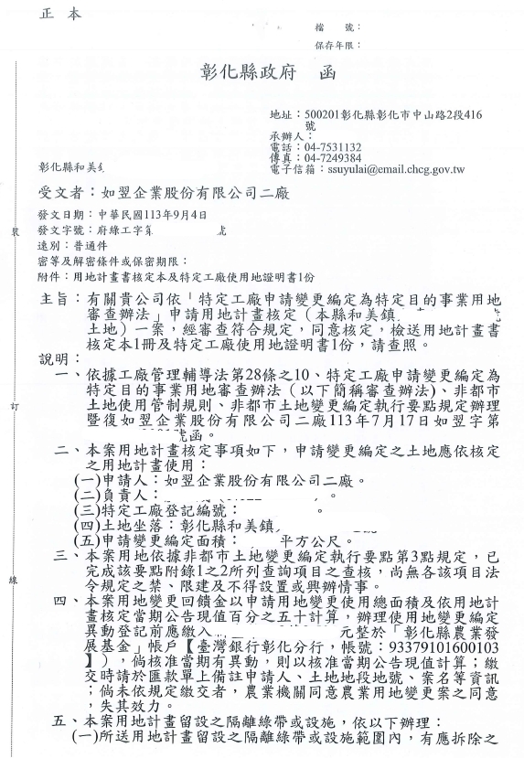 恭喜 如翌企業股份有限公司 特登工廠用地計畫核定 !!