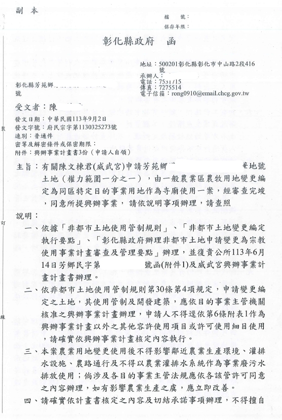 恭喜 芳苑威武宮 變更寺廟用地變更編定完成(農地變建地)!!!